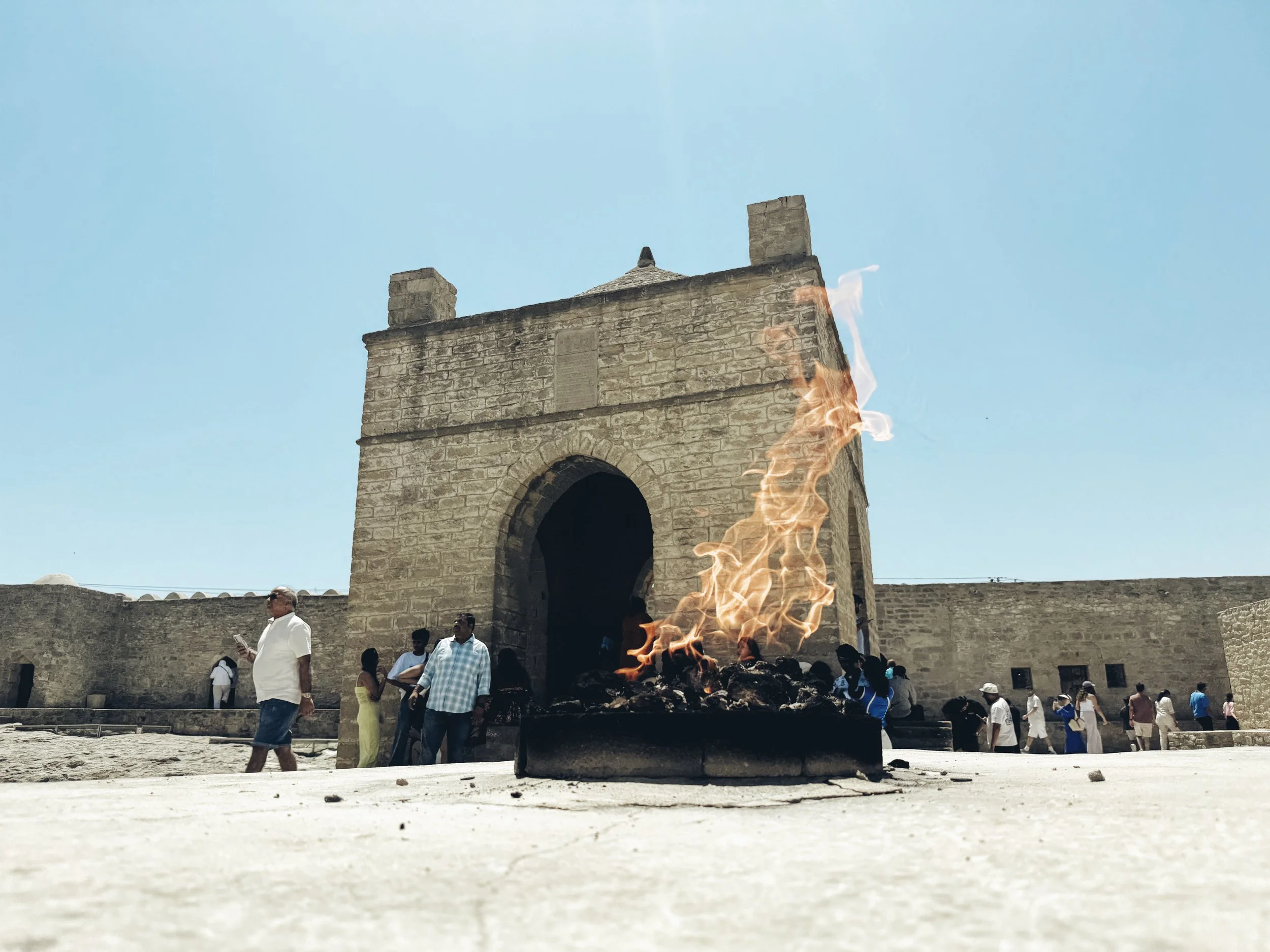 El Templo Ateshgah, ubicado en las afueras de Bakú, fue un santuario zoroástrico activo entre los siglos XVII y XIX. Se construyó sobre un yacimiento de gas natural cuya combustión producía un fuego perpetuo, considerado sagrado. Esta llama atrajo peregrinos de regiones zoroástricas de Persia y comunidades hindúes del norte de la India, que veían en el fuego un símbolo de pureza espiritual. Su arquitectura pentagonal y cúpula central reflejan la fusión de estilos persas e indios.