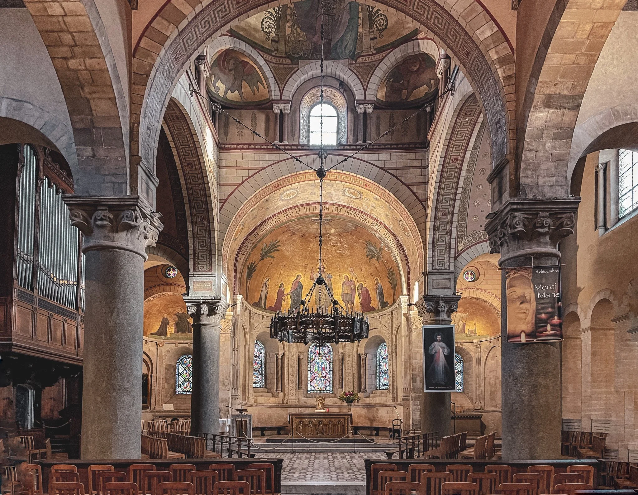 En Saint-Martin d’Ainay, dos de sus discípulos, Pollet y Benoît, aplicaron esa idea a fondo, con el objetivo de devolver la iglesia a su estilo románico puro. Destruyeron mosaicos medievales porque no encajaban con la época original, construyeron capillas laterales tomando inspiración de un claustro que había desaparecido durante las guerras religiosas de 1562, y modificaron la fachada para hacerla “más armónica”.